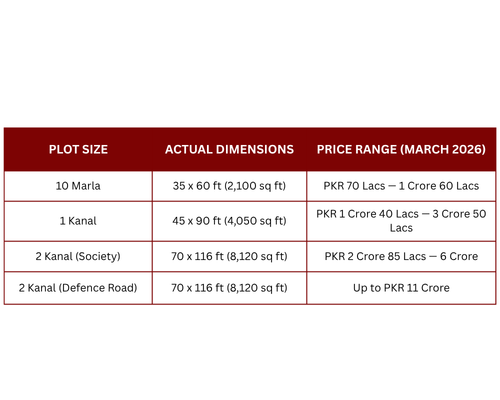 2 Kanal (Actual Size: 36 Marla | 70 x 116 ft | 8,120 sq ft) The premium residential and commercial option. Within the society, prices range from PKR 2 Crore 85 Lacs to PKR 6 Crore. For 2 Kanal plots situated on the main Defence Road, prices reach up to PKR 11 Crore — reflecting both the size and the unmatched road frontage.